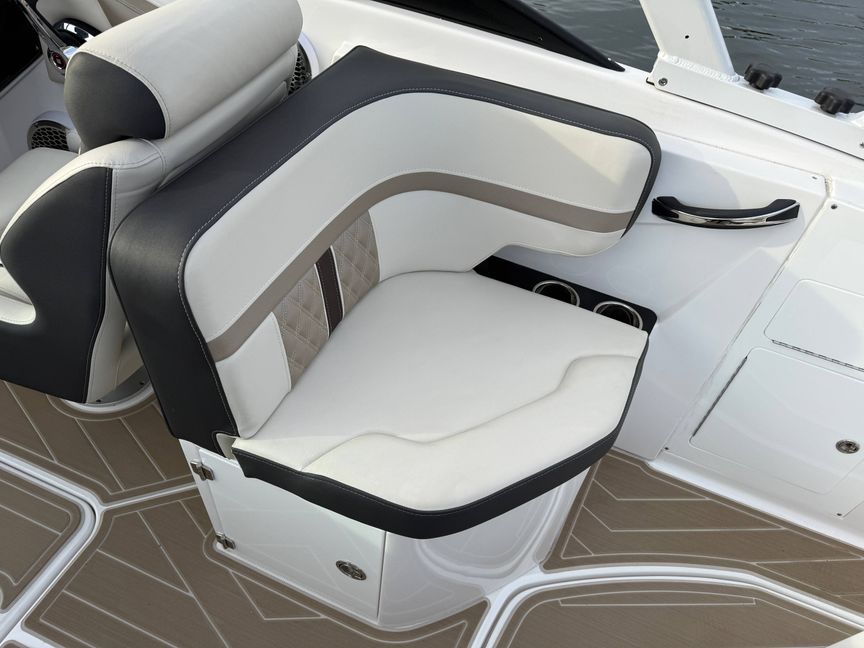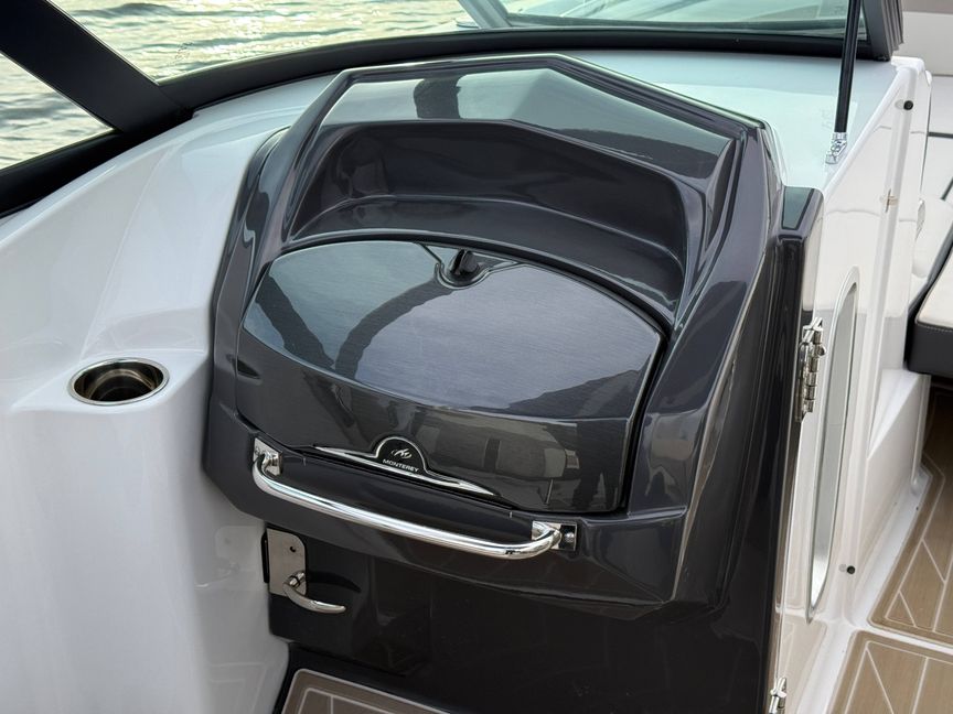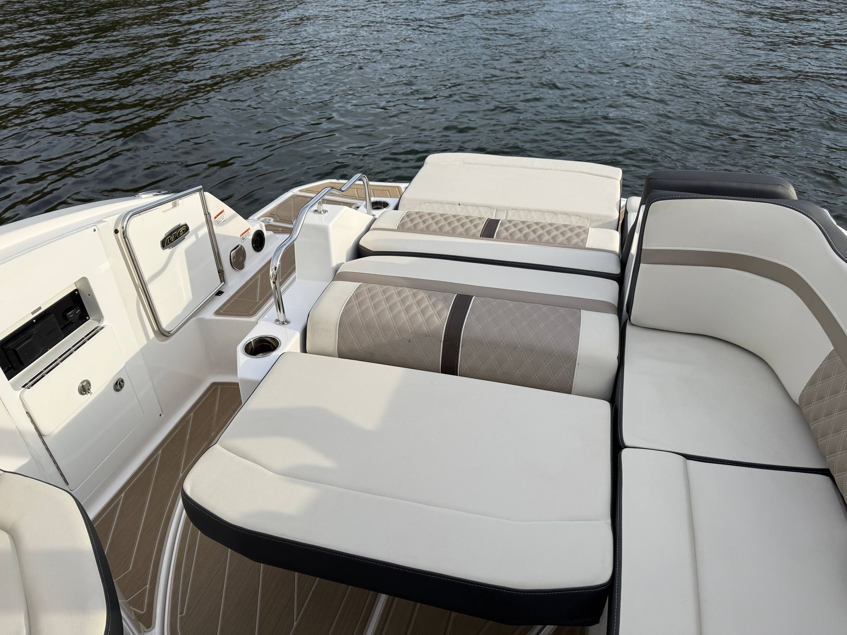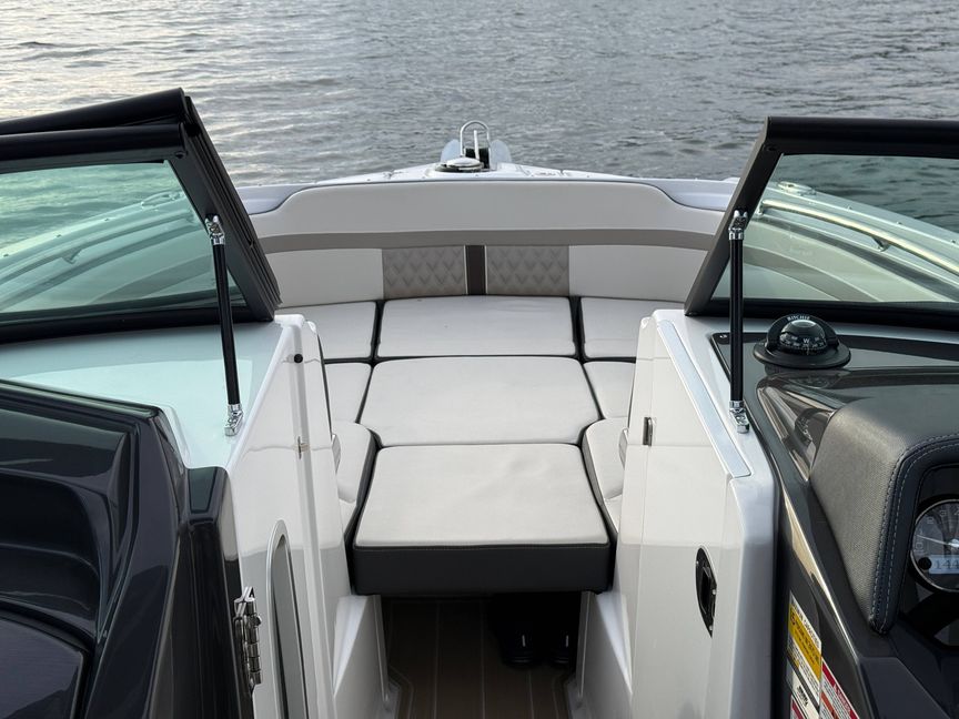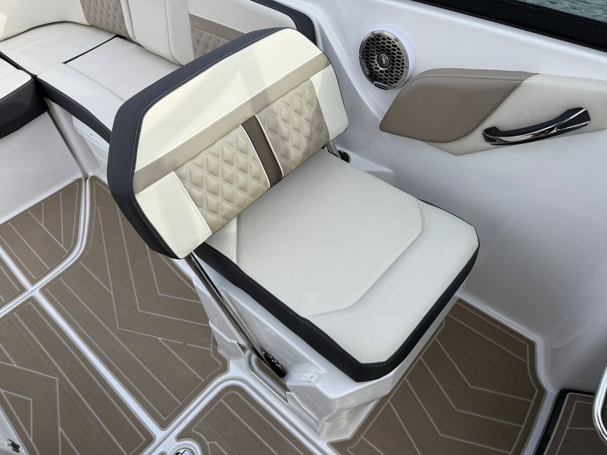 The M6 has everything you’ll need to enjoy a full day of cruising, skiing, wakeboarding and tubing. Featuring spacious seating and storage options, a spacious head compartment, two recessed and telescoping boarding ladders located in the bow and stern, and a Fusion satellite ready AM/FM stereo complete with 10" subwoofer and HLCD based tower speakers. You'll have everything you need to enjoy your time-out on the water. With the standard signature graphics and colored hull, you’re sure to have one of the sharpest boats on the water. The M6 is style, luxury and performance personified!