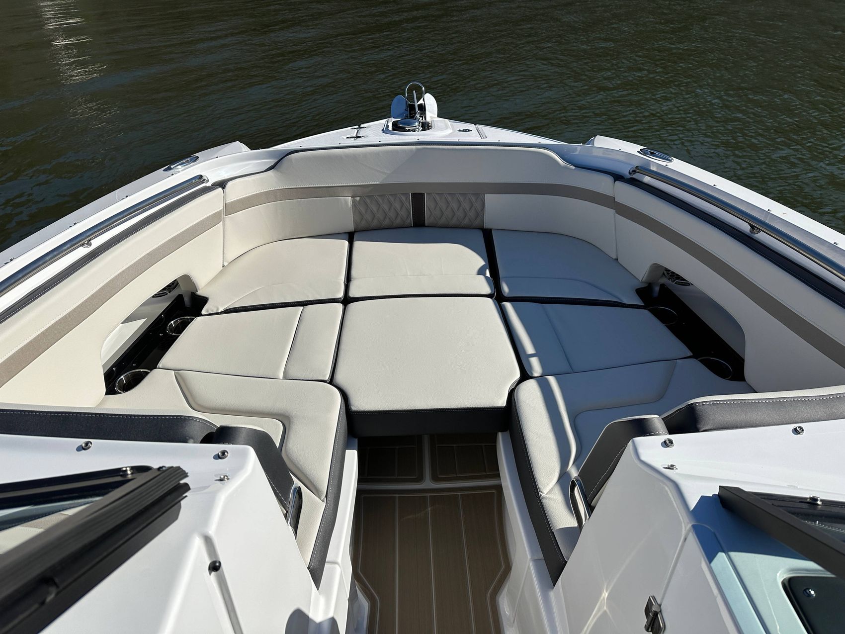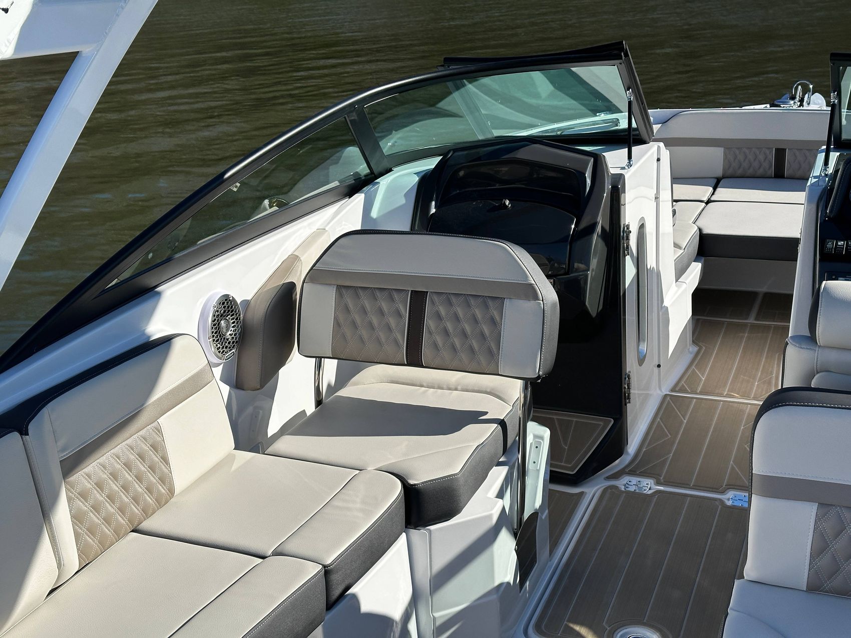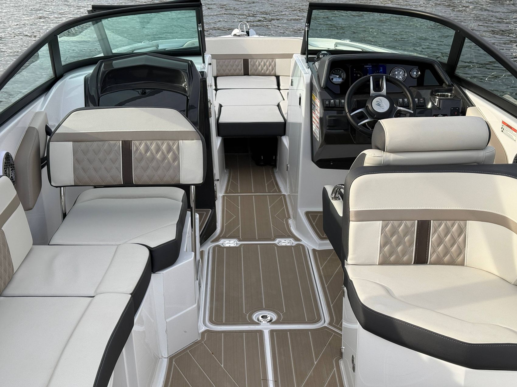 The M6 has everything you’ll need to enjoy a full day of cruising, skiing, wakeboarding and tubing. Featuring spacious seating and storage options, a spacious head compartment, two recessed and telescoping boarding ladders located in the bow and stern, and a Fusion satellite ready AM/FM stereo complete with 10" subwoofer and HLCD based tower speakers. You'll have everything you need to enjoy your time-out on the water. With the standard signature graphics and colored hull, you’re sure to have one of the sharpest boats on the water. The M6 is style, luxury and performance personified!